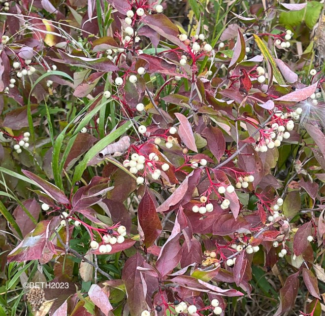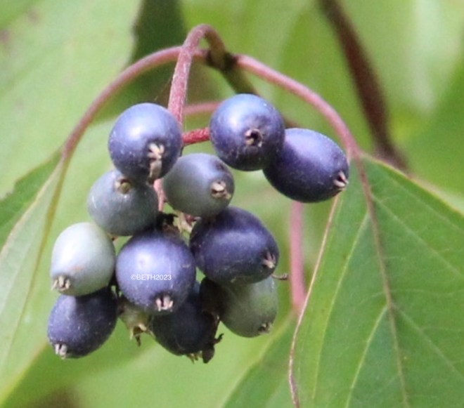 Migrating songbirds, as well as turkeys and grouse, favor the white berry-like drupes of gray dogwood (Cornus racemosa).