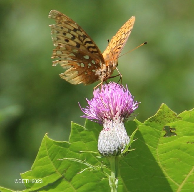 Faded colors and worn, jagged-edged wings indicate an elderly great-spangled fritillary nectaring on this thistle.