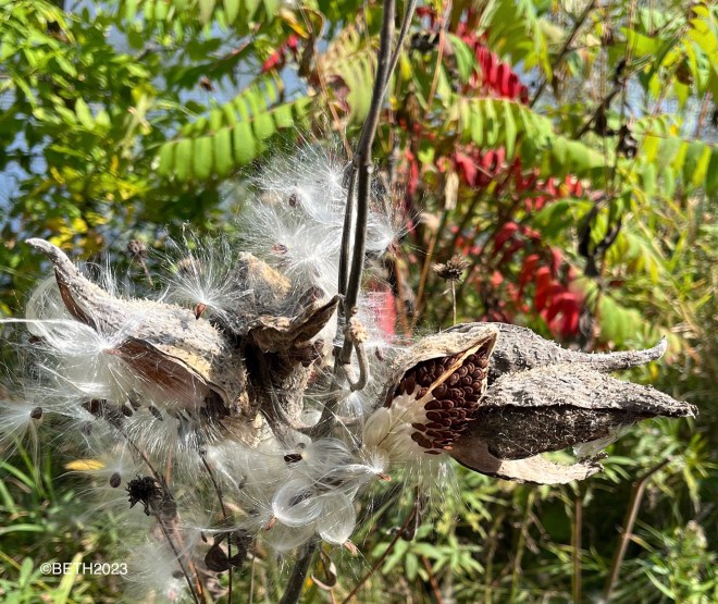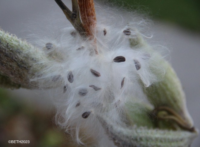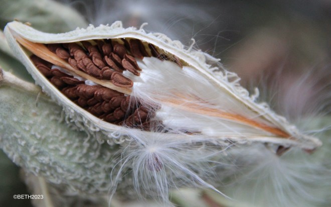Over the summer, small, perfumed pink flowers are fertilized and form tiny green pods or follicles. As they ripen, they grow to three-to-five inches in length. Inside, oval-shaped flat, brown seeds tethered to white, satiny strands designed for wind dispersal are arranged around a central column. Each is neatly tucked into a crevice on a membrane attached to the top and bottom of the pod.