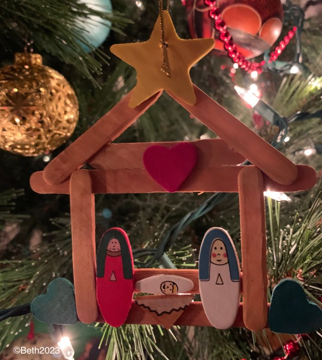 Some of the ornaments are handmade, such as the madonna and child that my sister cross-stitched when she was pregnant with her first child. A hand-knitted pair of tiny green-and-white mittens, a child’s wooden rocking horse, miniature Winnie-the-Pooh and Piglet figurines, and a sliver of a Santa moon are just a few of many special ornaments we received when our son was a baby. As he grew, he created his own decorations; from his toddler hand print and “Christmas countdown” paper chains, to a Nativity creche, candle, and beaded snowflake ornaments made in elementary school. He was so eager to show us his creations that it was hard for him to wait until Christmas!
