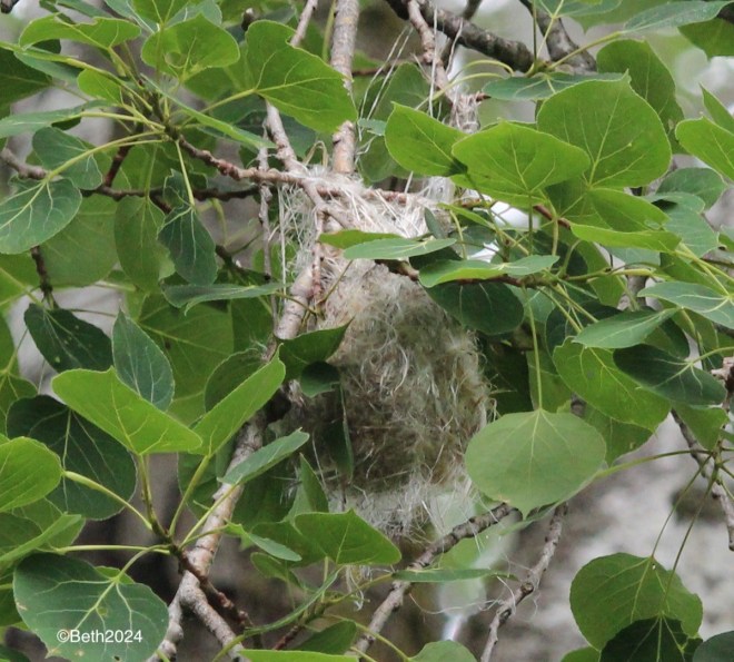 Most years, they weave a nest in the outer branches of quaking aspens that overhang our cabin yard, but one year, they nested in a red oak tree next to the cabin. The female constructs the nest using a combination of plant fibers, such as long strips of bark from grape and other vines, grasses and hair. She often selects artificial fibers, too — yarn, fishing line and twine. The two outer layers of the nest provide the saclike structure. The third inner layer consists of soft hair, wool and downy fibers to protect the eggs and hatchlings.