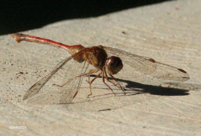 An autumn meadowhawk dragonfly (Sympetrum vicinum) suns on our garden wall. These dragonflies often remain active into November.