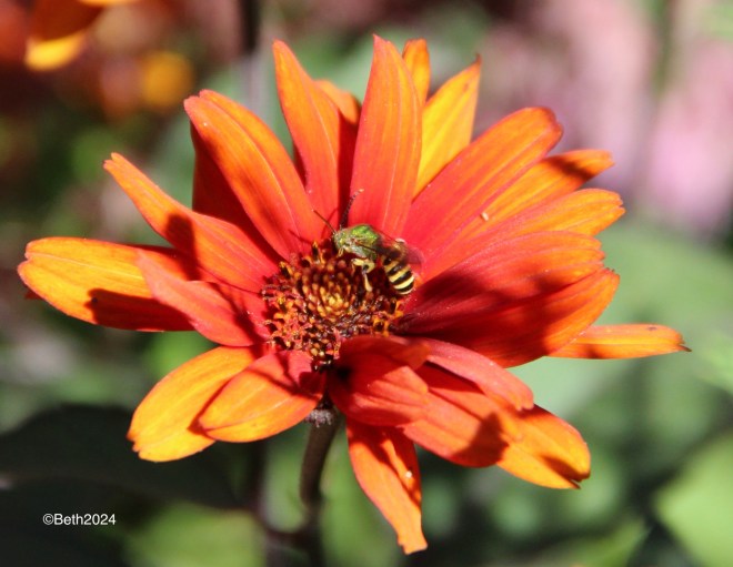 A green bee (Agapostemon ssp.) nectars on (Heliopsis ‘bleeding heart’).