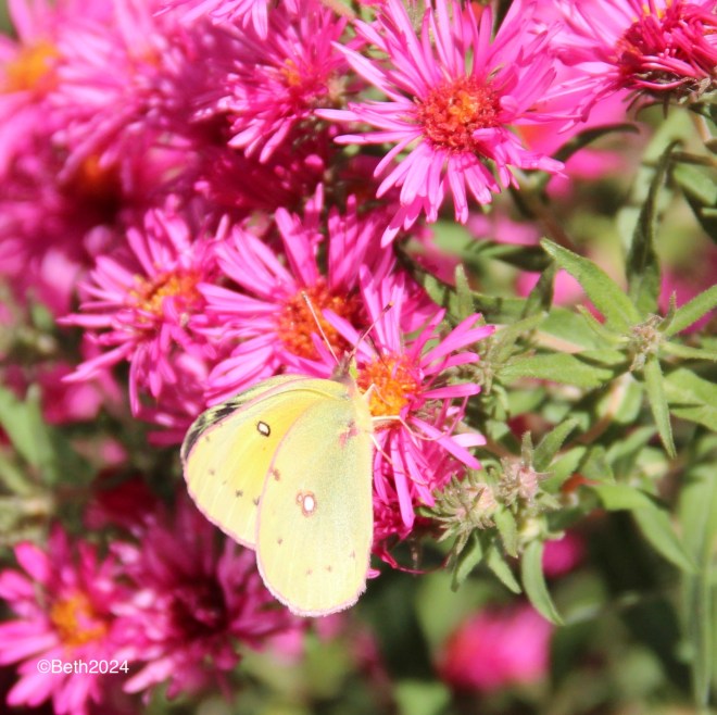 An orange sulphur (Colias eurytheme), nectars on the last of the asters (Symphyotrichum novae-angliae).