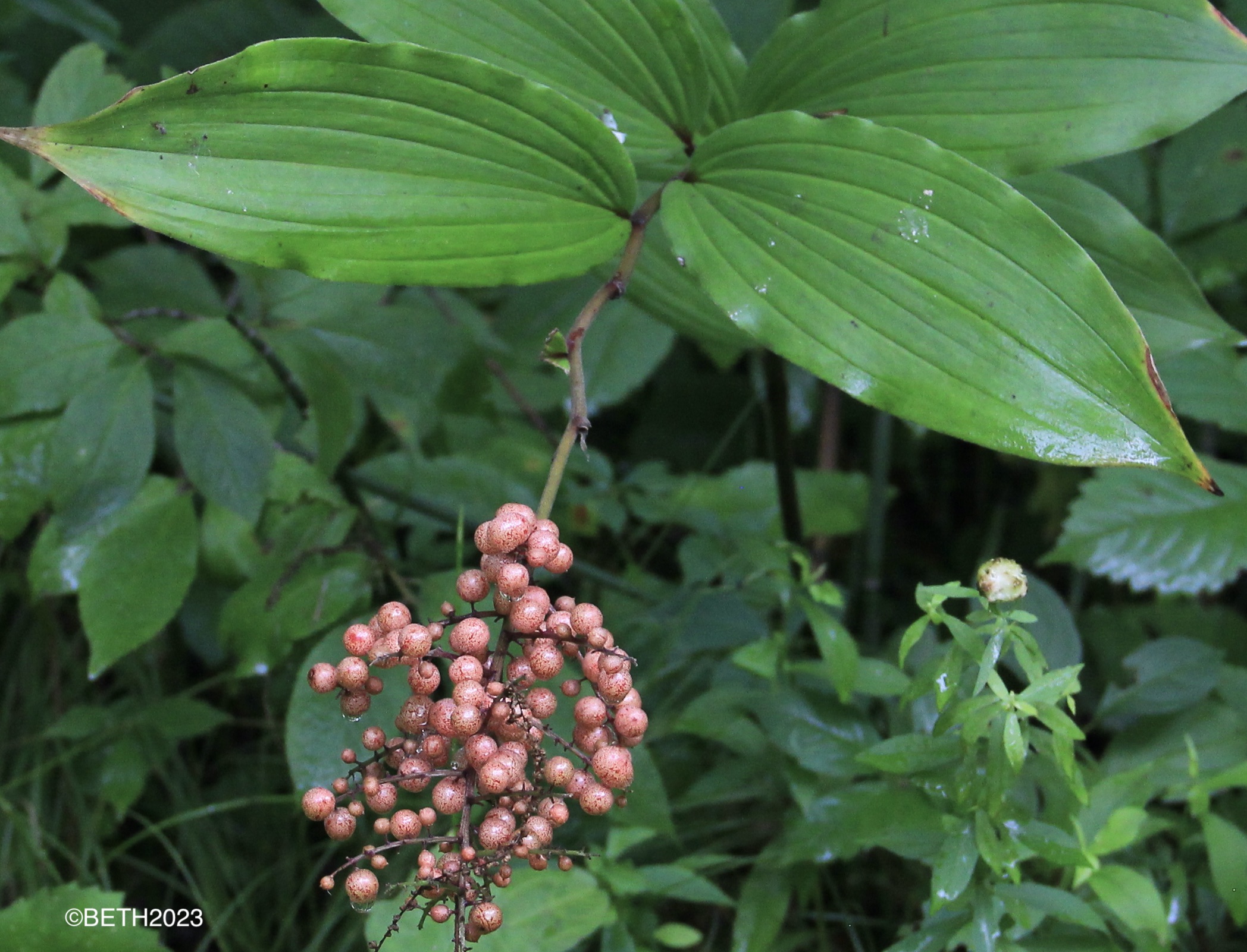 False Solomon’s seal (Maianthemum racemosa) fruit are often pink with red spots, but also can be solid red. They are eaten by woodland birds, such as the veery, and by white-footed mice.