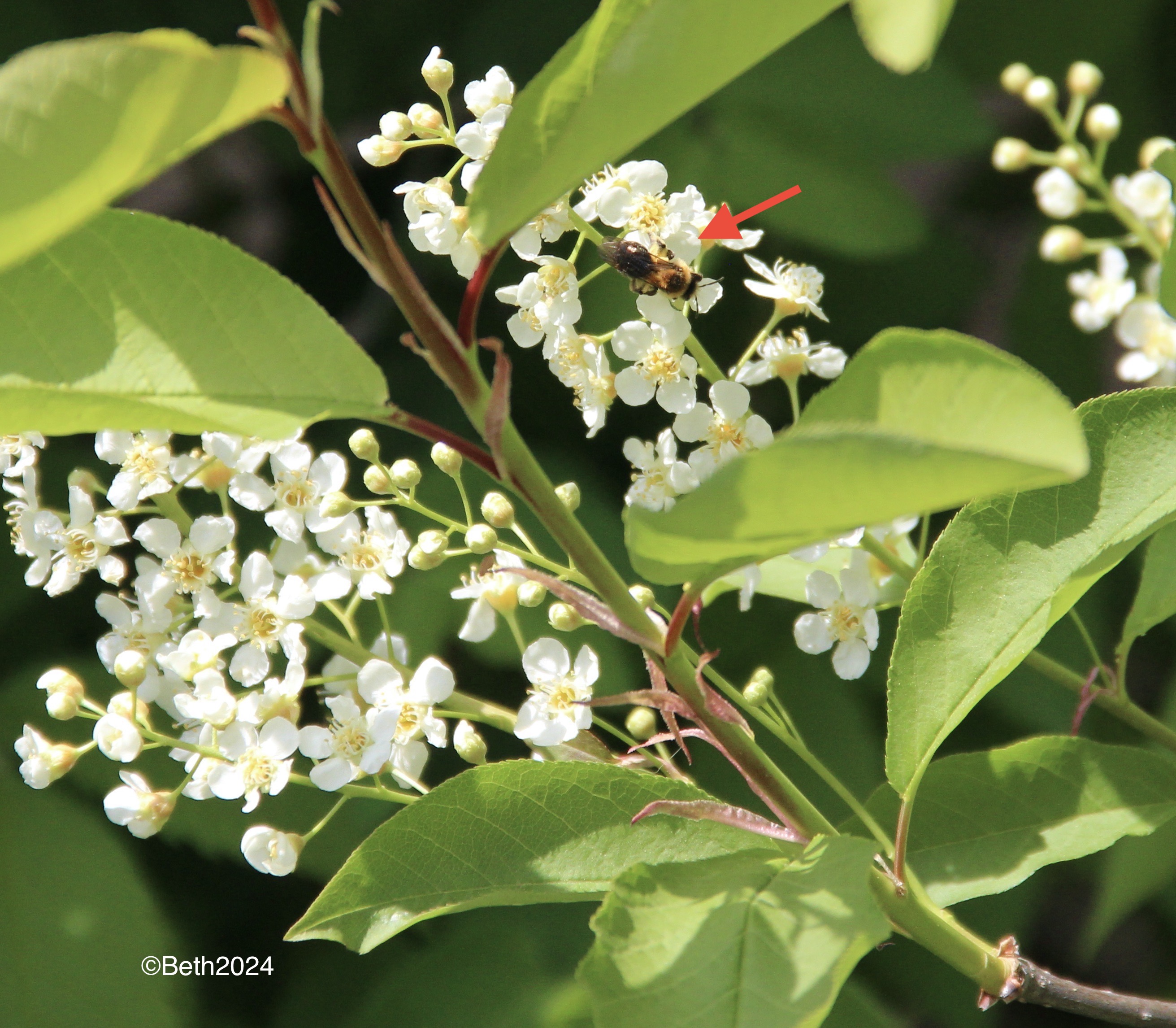 A mining bee (Andrena spp.) pollinates Canada cherry blossoms (Prunus virginiana, ‘Canada Red’).