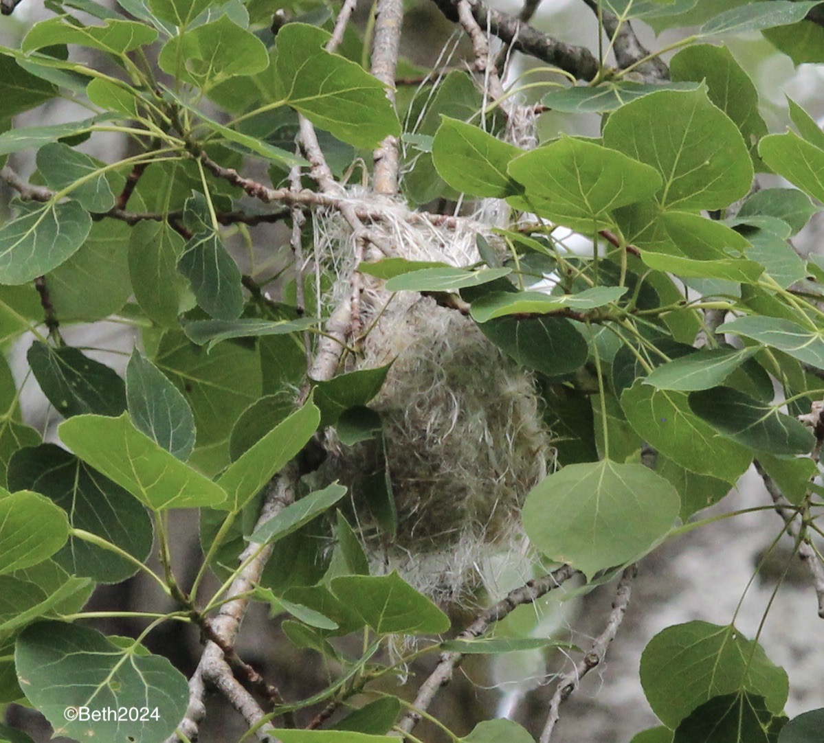 Most years, they weave a nest in the outer branches of quaking aspens that overhang our cabin yard, but one year, they nested in a red oak tree next to the cabin. The female constructs the nest using a combination of plant fibers, such as long strips of bark from grape and other vines, grasses and hair. She often selects artificial fibers, too — yarn, fishing line and twine. The two outer layers of the nest provide the saclike structure. The third inner layer consists of soft hair, wool and downy fibers to protect the eggs and hatchlings.