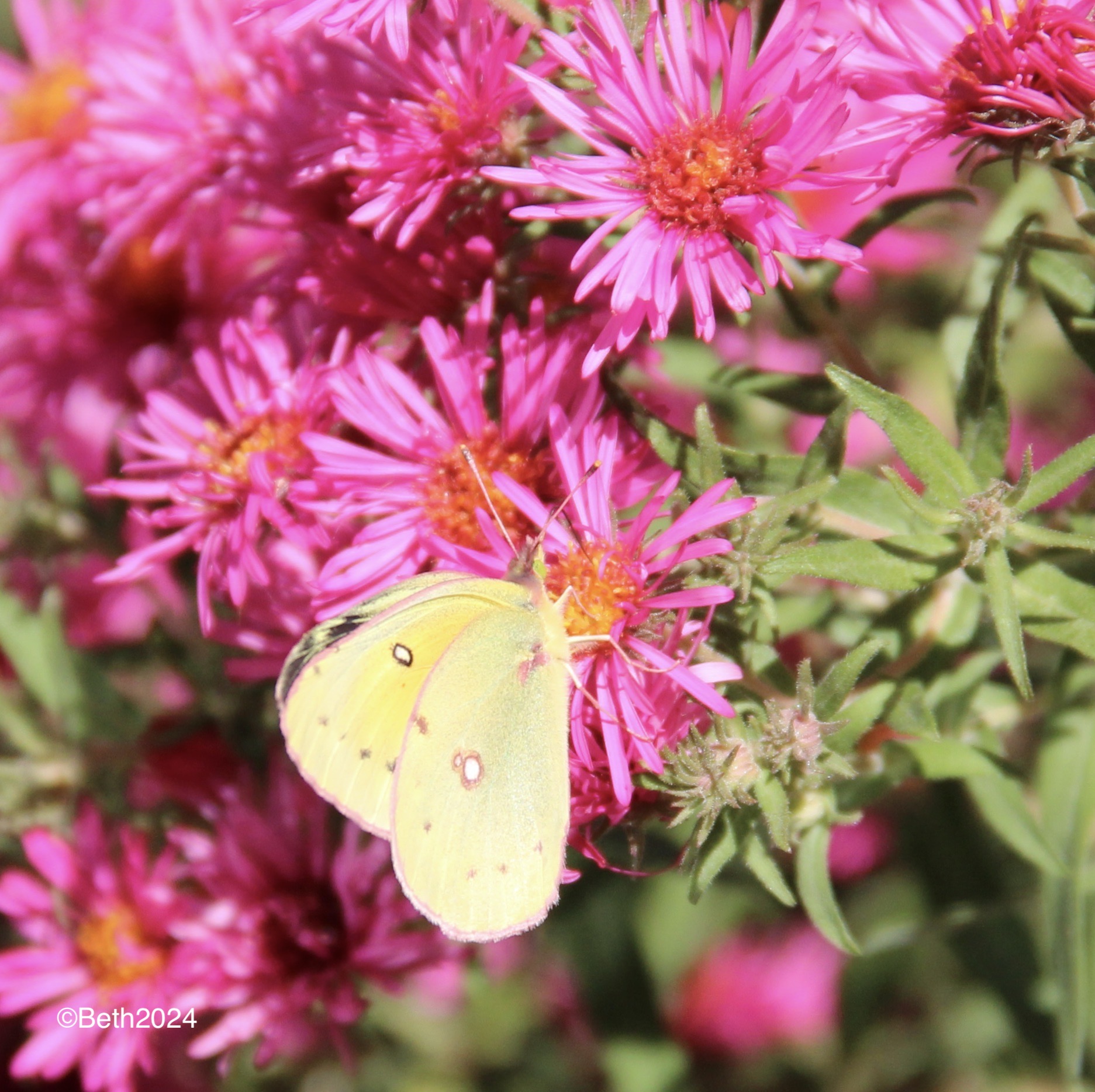 An orange sulphur (Colias eurytheme), nectars on the last of the asters (Symphyotrichum novae-angliae).