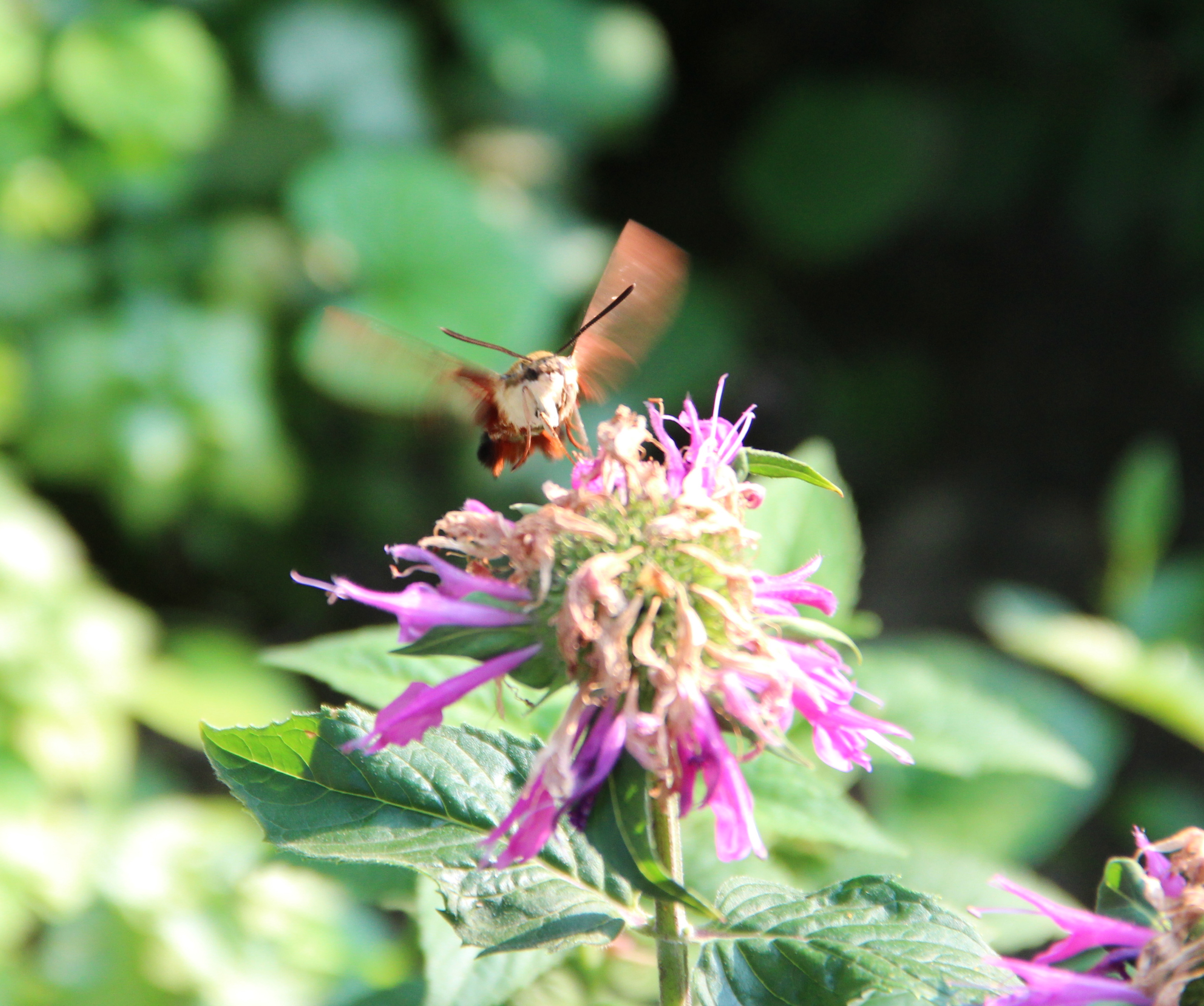 Next time you think you see a small hummingbird zip around your garden, take a closer look — it just might be a hummingbird clearwing moth. People usually think of moths as nocturnal creatures attracted to lights. But clearwing moths are colorful daytime visitors to flowers. Only about half the size of a hummingbird, this moth has a thick, heavy body in comparison to many moths, large, clear wings with reddish-brown borders, and a long proboscis for sipping nectar. In our garden, they seem to prefer monarda or bee balm, in particular the native variety (Monarda fistulosa). I’ve also seen them sip nectar from garden phlox, petunias and common milkweed.