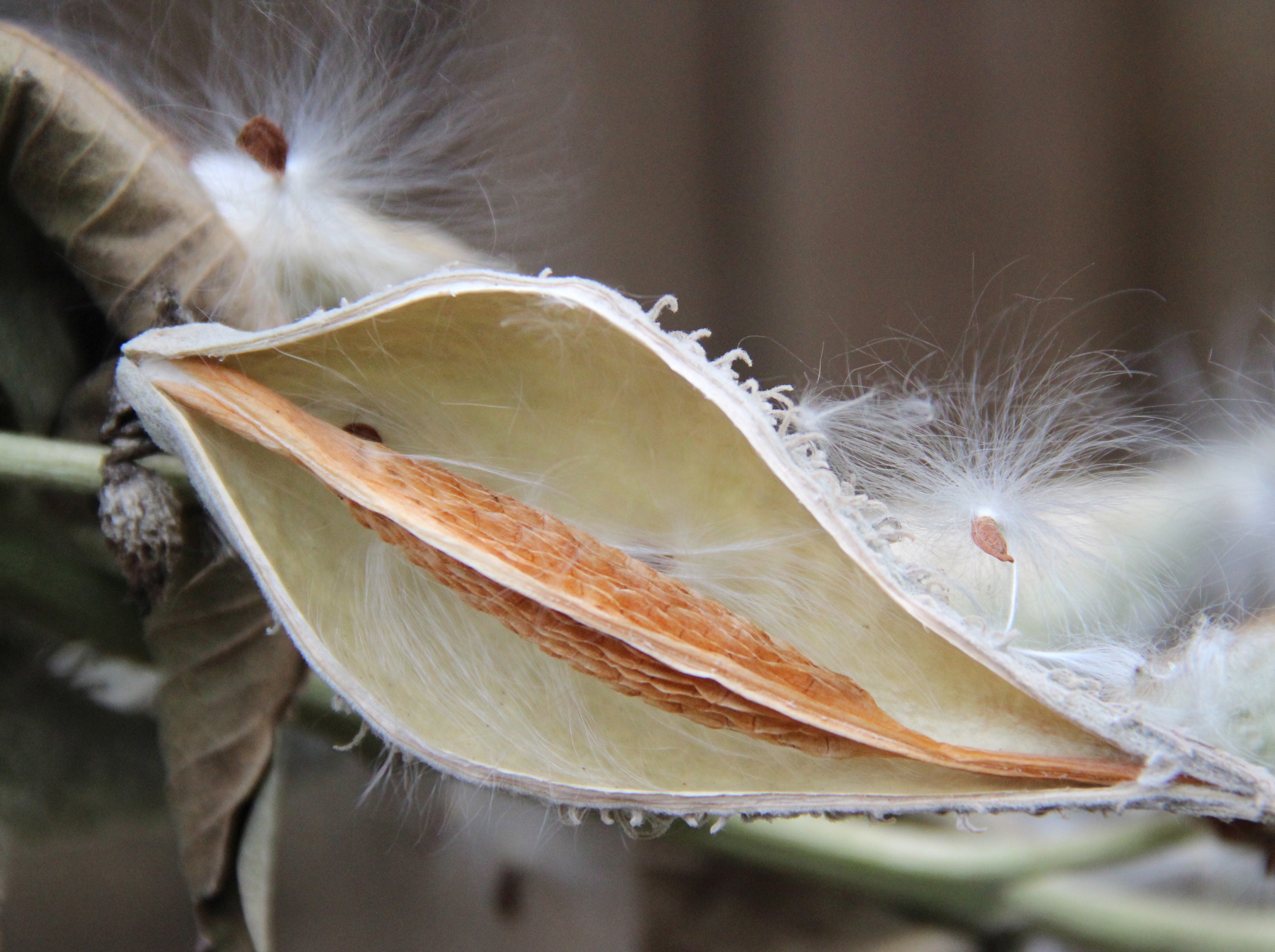 A few seeds still cling to the soft, empty cup of a milkweed pod (Aesclepias syriaca).