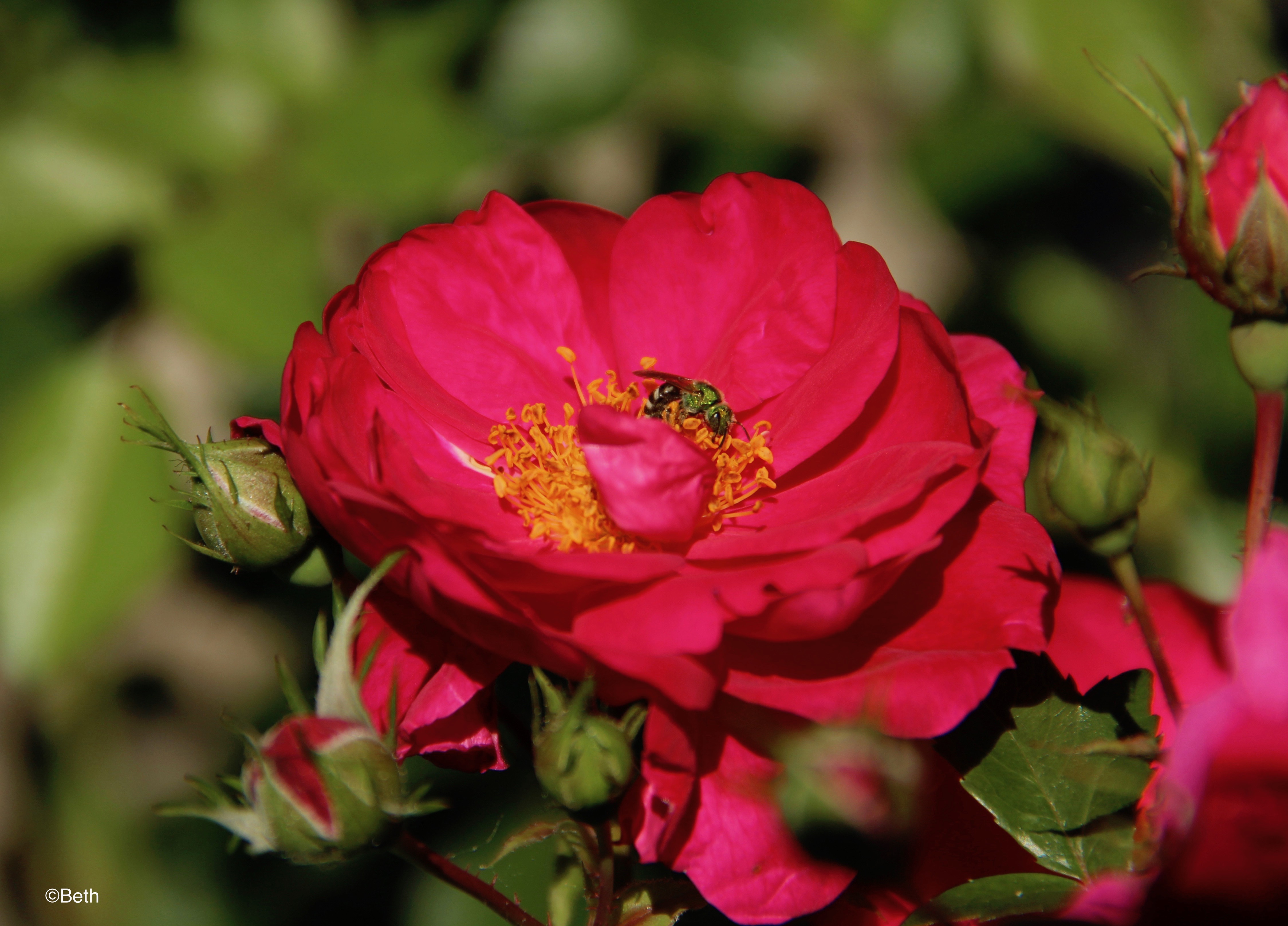 Planted on the south side of our red-brick garage, many of the canes remain green each year. In the toughest winter, it died back to 18 inches above the ground, but recovered quickly, bloomed well and on time. The roses, though simple, give off a light, spicy scent and attract many different types of bees. Red admiral butterflies pollinate them, too. Over the years, it has become a symbol of spring to me. I watch for the greening of the canes and the first red leaf buds to appear about the same time that crocus and Siberian squill bloom.
