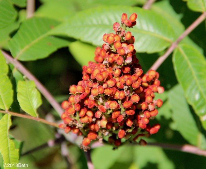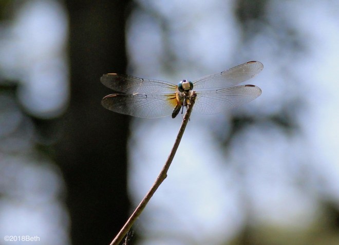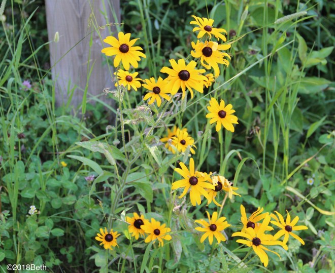 I love the lush canopy of green leaves untouched by any change of color. These trees are primarily white oak with an understory of dogwood, chokecherry, sumac and common elderberry. Though we hadn’t reached the peak bloom time of native wildflowers, a few species blossomed on the woodland edges: vervain, common yarrow, tick trefoil, water lilies, monarda and the year’s first black-eyed Susan’s. In the marshy areas, dragonflies hovered and darted like flashing jewels. We set our stride for a long, peaceful hike content to be still and absorb the quiet beauty.