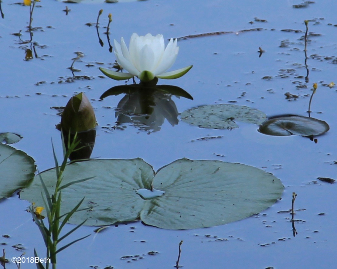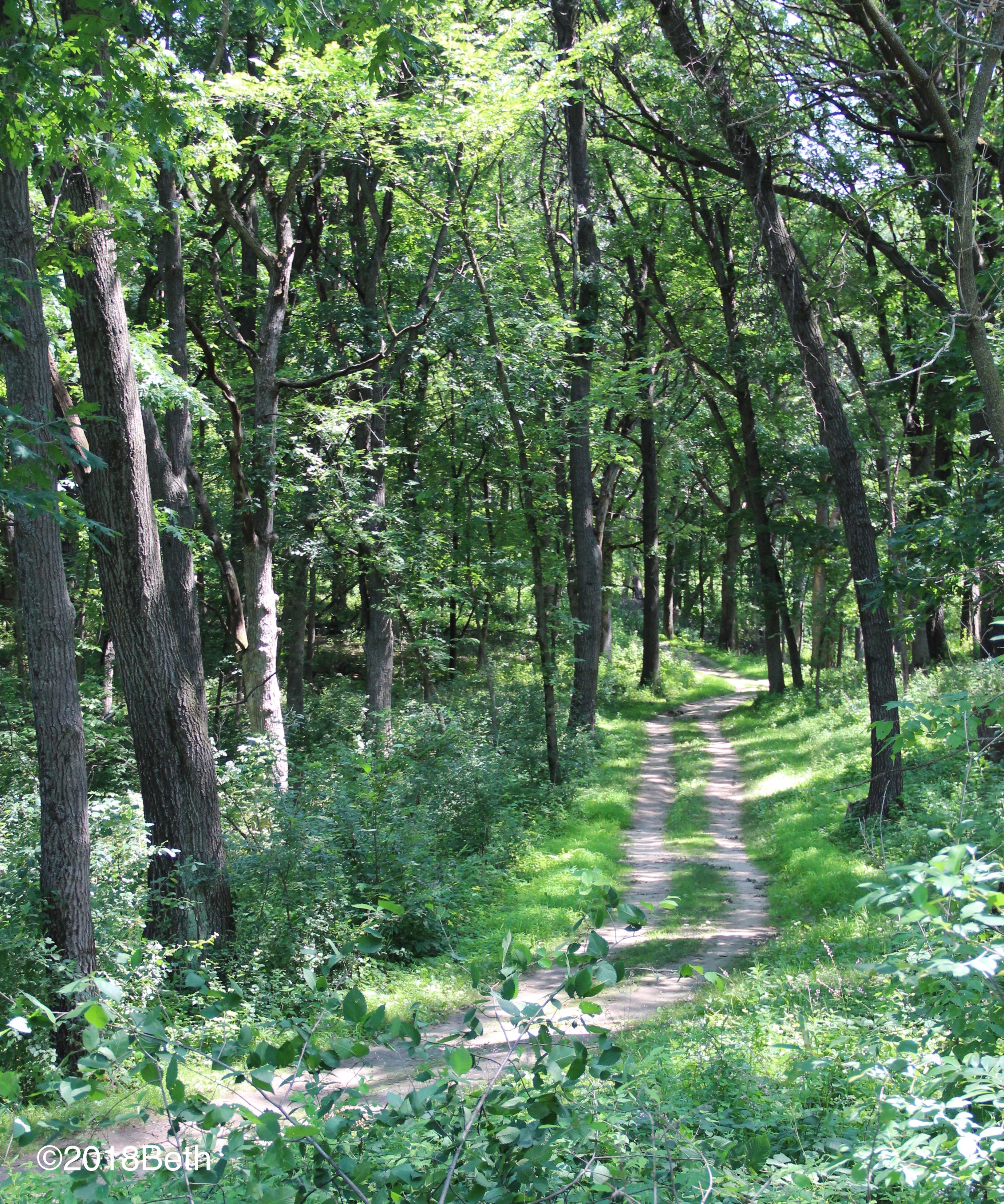 I love the lush canopy of green leaves untouched by any change of color. These trees are primarily white oak with an understory of dogwood, chokecherry, sumac and common elderberry. Though we hadn’t reached the peak bloom time of native wildflowers, a few species blossomed on the woodland edges: vervain, common yarrow, tick trefoil, water lilies, monarda and the year’s first black-eyed Susan’s. In the marshy areas, dragonflies hovered and darted like flashing jewels. We set our stride for a long, peaceful hike content to be still and absorb the quiet beauty.