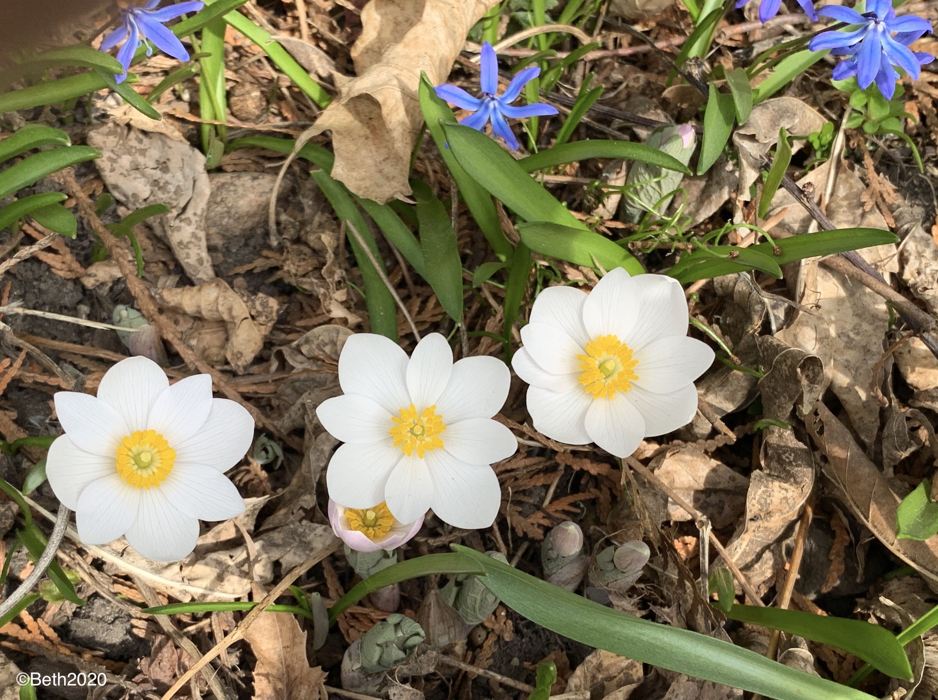 Striped squill (Puschkinia scilloides), Siberian squill (Scilla siberica) and crocus bloom before last week’s snowstorm.