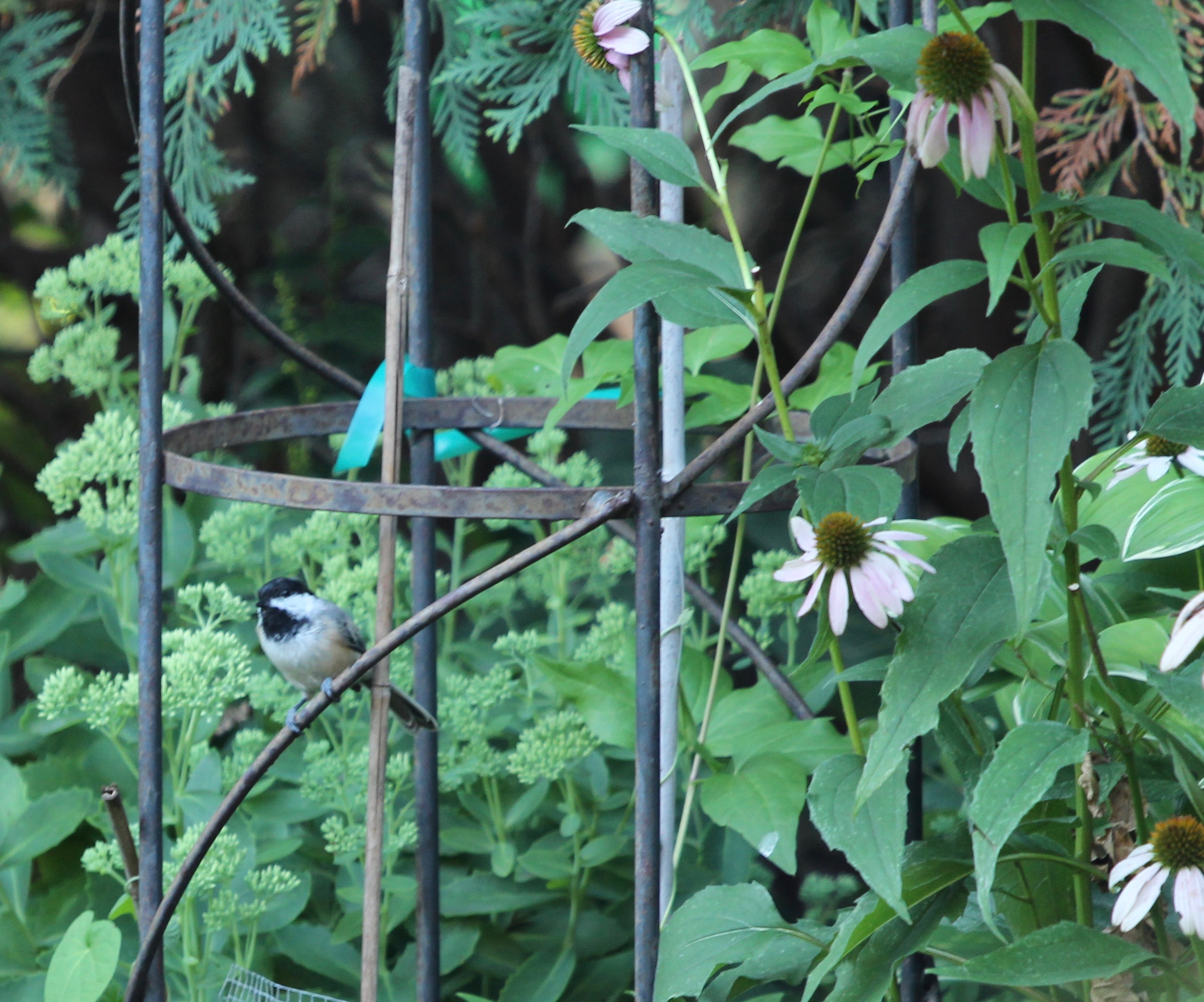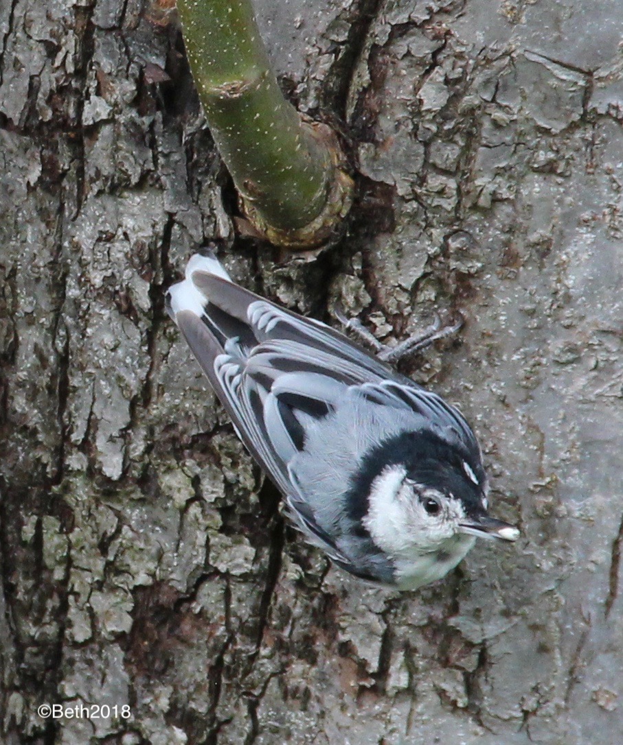 When left to their own resources, Baltimore orioles typically eat caterpillars, moths and many other types of insects. Like warblers and flycatchers, they dart out and back from foliage to snatch flying insects. At other times, they remind me of chickadees as they perform acrobatics over and under tree branches in search of beetles, aphids and spiders. They also like flower nectar and fruit, and can sometimes damage fruit crops. During spring and fall migration, our neighbors, Ed and Melinda, keep a fresh dish of grape jelly on their deck railing for the orioles. My father-in-law always suspended fresh orange slices from the bird feeder pole for them. Both delights attracted lots of orioles (and hornets in autumn)!