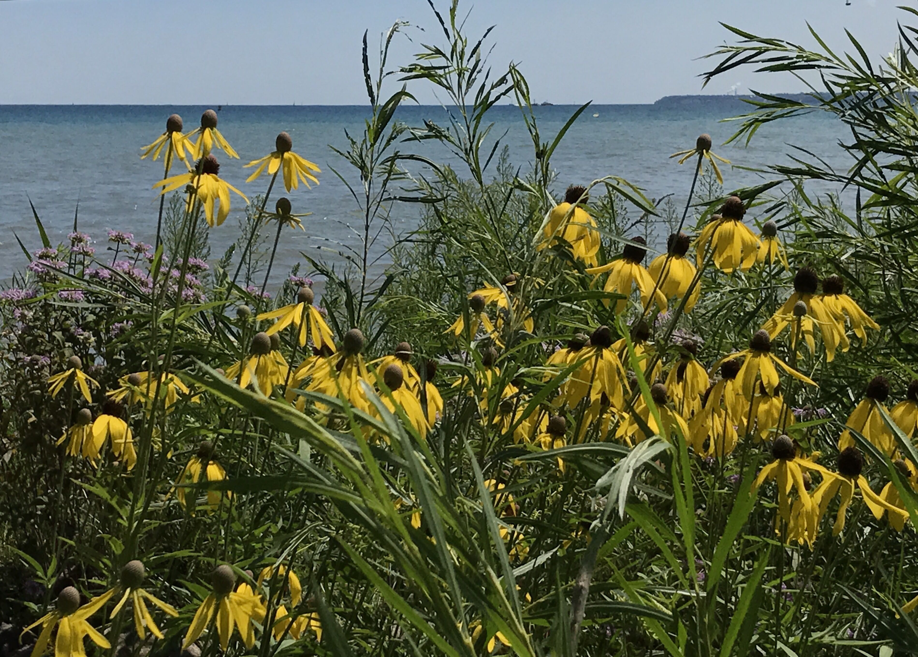 In August, many wildflowers begin to bloom in the Upper Midwest. Bees, wasps, moths and butterflies visit them for nectar and pollen. While in Milwaukee, Wisconsin, last weekend, we walked along Lake Michigan to enjoy the warm sun, gentle breeze and flowers both native and non-native that grace the shoreline. Among the blooms were chicory, Queen Anne’s lace, everlasting pea, goldenrod, sweet clover, gray-headed coneflower, bouncing Bet, red clover, Black-eyed Susan, monarda and lesser burdock. (If you look closely, you’ll spot a few pollinators, too.)