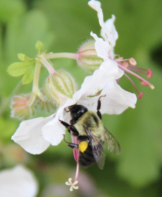 A bumble bee nectars in a wild geranium blossom (Geranium maculatum).