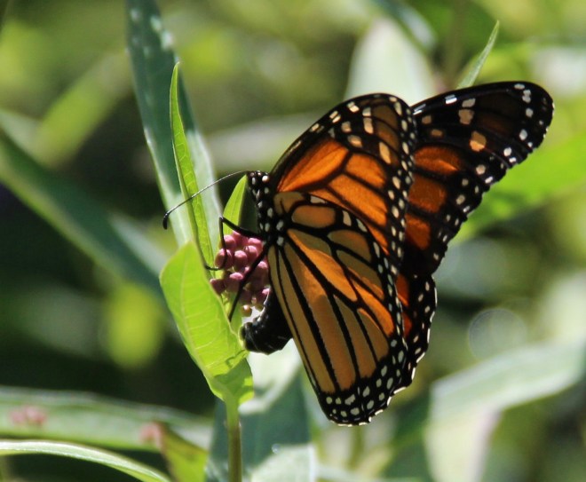 Adult monarchs (Danaus plexippus) and many other butterfly species nectar on common milkweed (Asclepias syriaca).