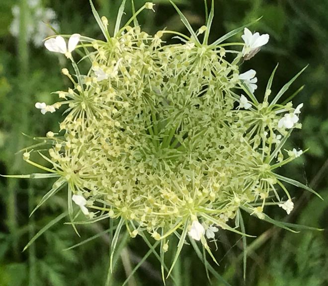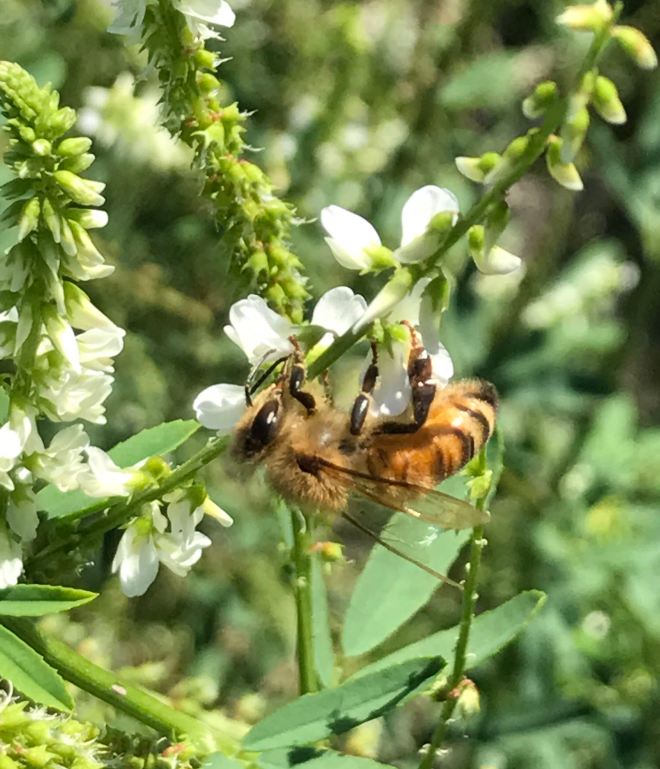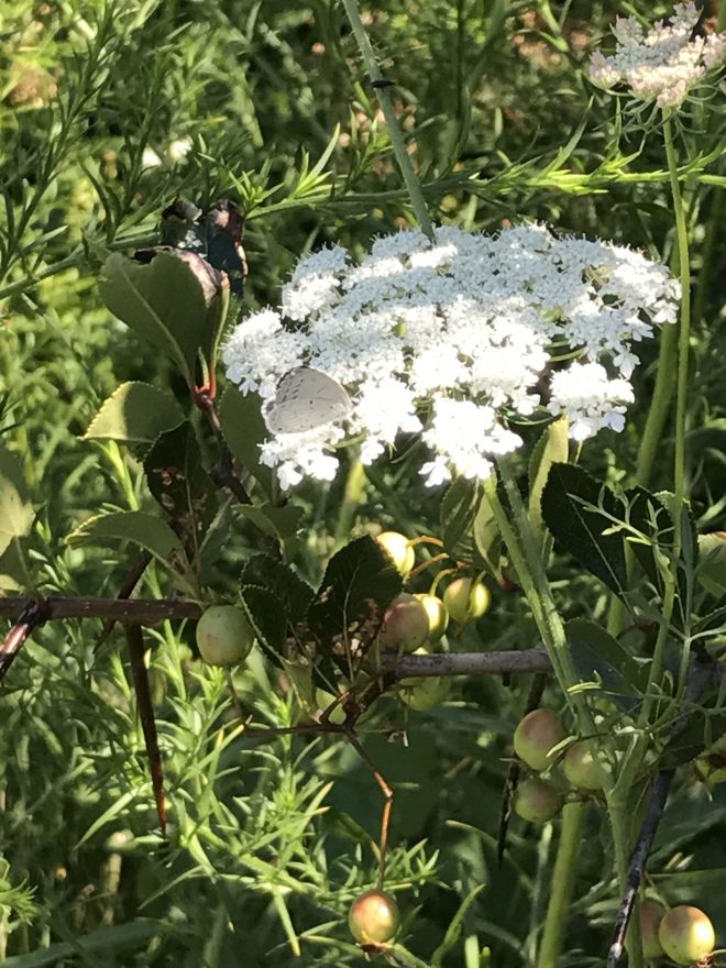 In August, many wildflowers begin to bloom in the Upper Midwest. Bees, wasps, moths and butterflies visit them for nectar and pollen. While in Milwaukee, Wisconsin, last weekend, we walked along Lake Michigan to enjoy the warm sun, gentle breeze and flowers both native and non-native that grace the shoreline. Among the blooms were chicory, Queen Anne’s lace, everlasting pea, goldenrod, sweet clover, gray-headed coneflower, bouncing Bet, red clover, Black-eyed Susan, monarda and lesser burdock. (If you look closely, you’ll spot a few pollinators, too.)