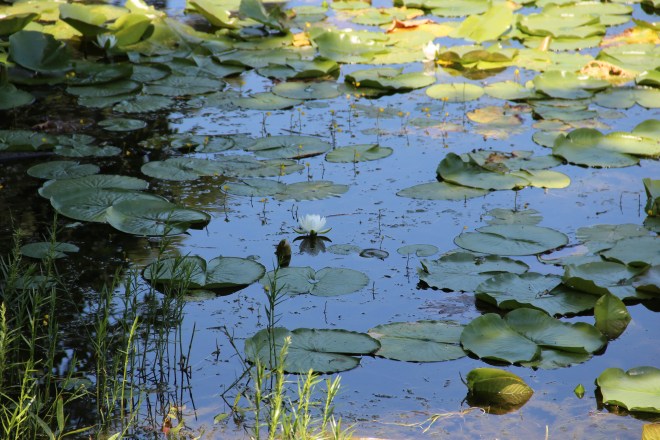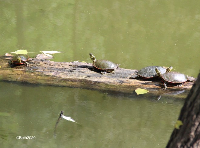 Dad taught us about the natural world a little differently from Mom’s gardening and nature lessons. He taught us to fish on the lakes surrounding Spooner, Wisconsin. We used children’s hand-held red droplines with colorful bobbers that first year. (I keep mine in my tackle box for the memories.) We baited our own hooks, watched our bobbers for nibbles, and learned to gently release the hook from bluegills, pumpkinseeds and other panfish. It wasn’t all fishing, however. We also took side trips into quiet bays where turtles lined up on logs to sun, loons swam with their chicks riding piggyback, and mats of waterlilies floated with their exotic-looking flowers and beautiful leaves. We relaxed in the warm morning sun and watched the blue damselflies that rested on the boat. It was peaceful.
