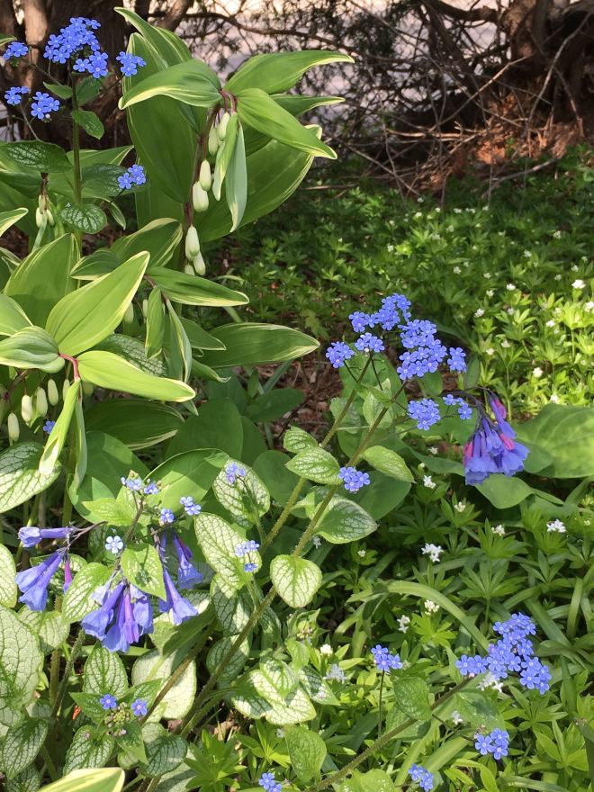 Virginia bluebells grow with tiny blue-flowered Siberian bugloss (Brunnera macrophylla “Jack Frost”), variegated Solomon’s seal (Polygonatum odoratum “Variegatum”), and sweet woodruff (Galium odoratum) in my small woodland garden.