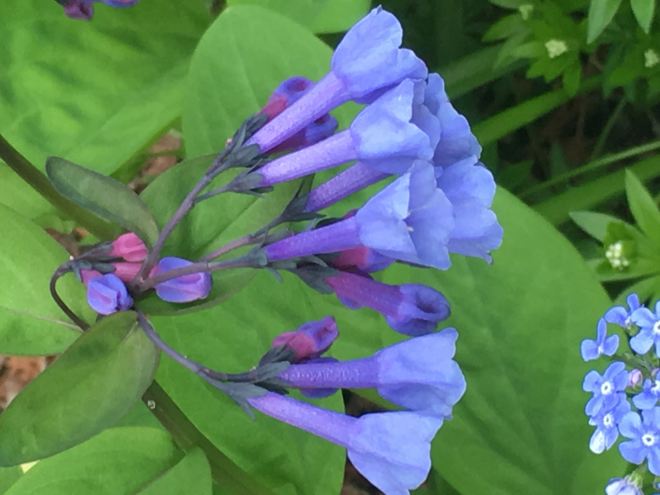 Virginia bluebells grow with tiny blue-flowered Siberian bugloss (Brunnera macrophylla “Jack Frost”), variegated Solomon’s seal (Polygonatum odoratum “Variegatum”), and sweet woodruff (Galium odoratum) in my small woodland garden.