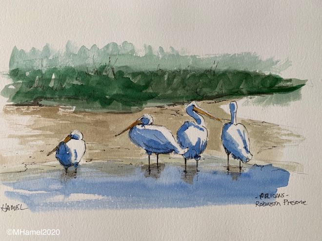 American white pelicans (Pelecanus erythrorhynchos) feed in a shallow wetland near the marshes. (Watercolor by my husband.)