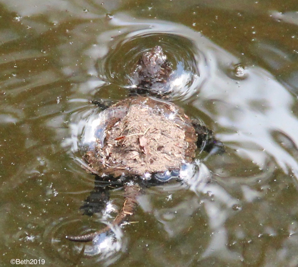 The hatchling headed straight into the water. Notice the grass and seeds picked up during its trip to the river.
