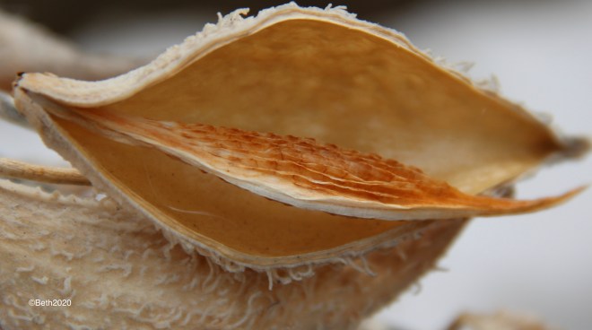 Over the summer, small, perfumed pink flowers are fertilized and form tiny green pods or follicles. As they ripen, they grow to three-to-five inches in length. Inside, oval-shaped flat, brown seeds tethered to white, satiny strands designed for wind dispersal are arranged around a central column. Each is neatly tucked into a crevice on a membrane attached to the top and bottom of the pod.