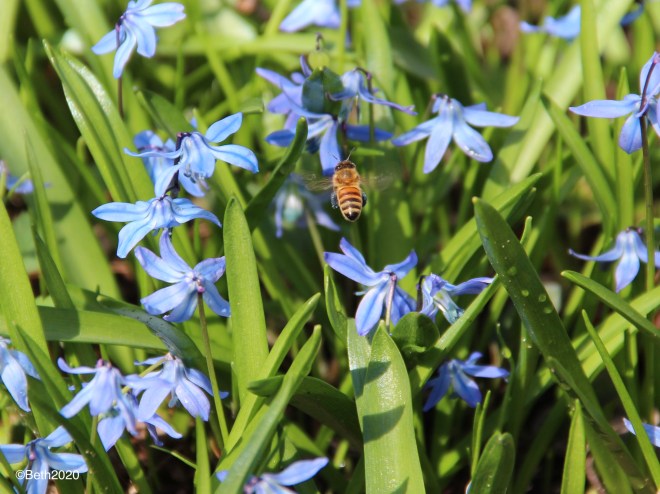 Native bloodroot flowers (Sanguinea canadensis) emerge with a single leaf tightly wrapped around each of them. (Notice the early native bee near the top of the photo!)