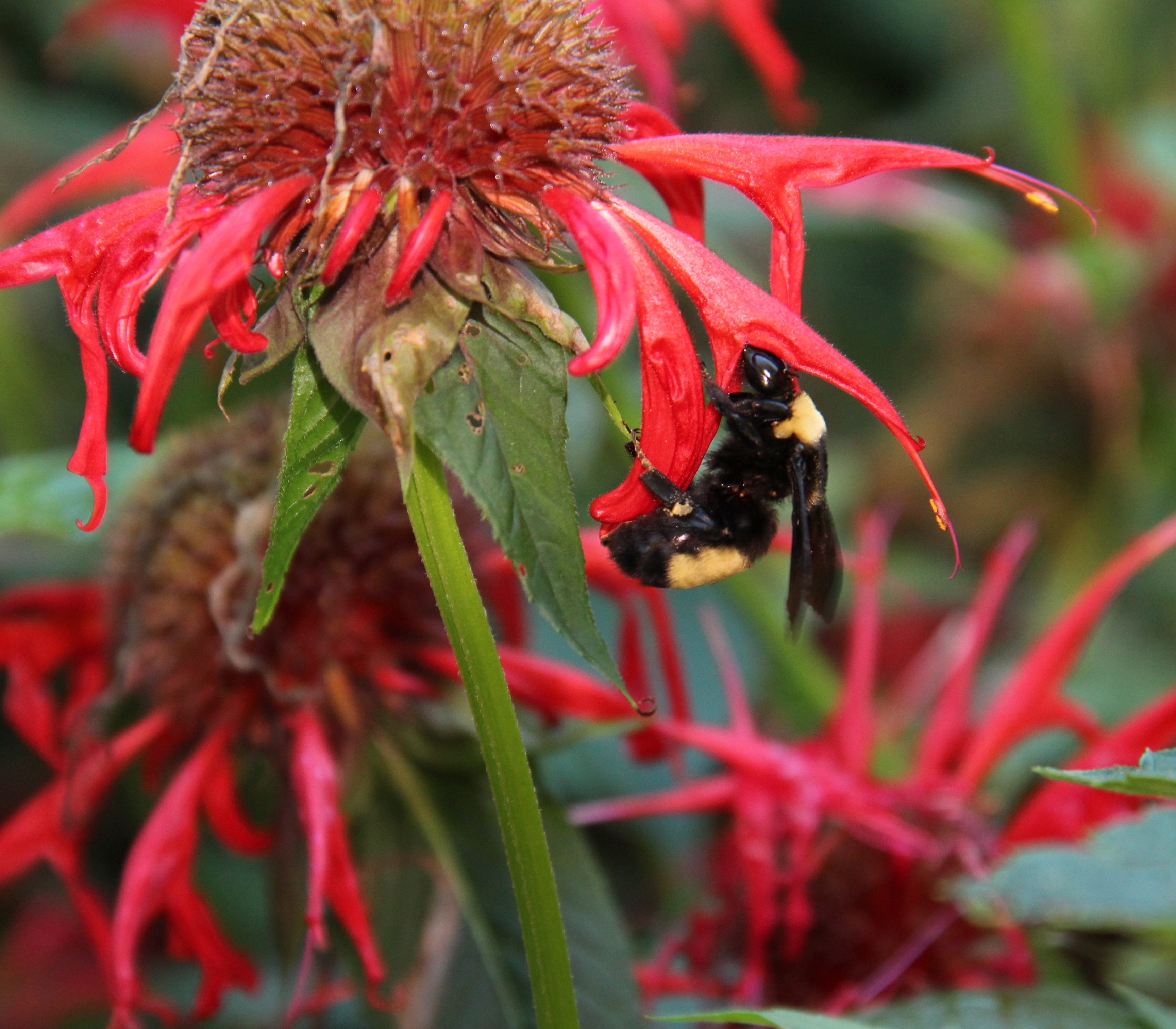 Bumble bees are native to North America, unlike honey bees, which were brought to the United States from Europe. Covered with thick, soft hair, bumble bees vibrate their strong flight muscles to raise their body temperature and fly at colder temperatures than other bees; as low as 41˚F (5˚C) in comparison to about 57˚F (14˚C) for honey bees. They pollinate flowers and crops both earlier and later in the season than most species. I love the sound of their buzzing in the autumn garden, which is much quieter now than the busy insect-filled garden of just two weeks ago. The bumble bees will fly until early November if the weather stays mild. Then, only the young queen bees will overwinter to create new colonies next spring. I miss all of the bee activity during the winter and look forward to seeing a queen bumble bee collect pollen and nectar in the first crocus next April.