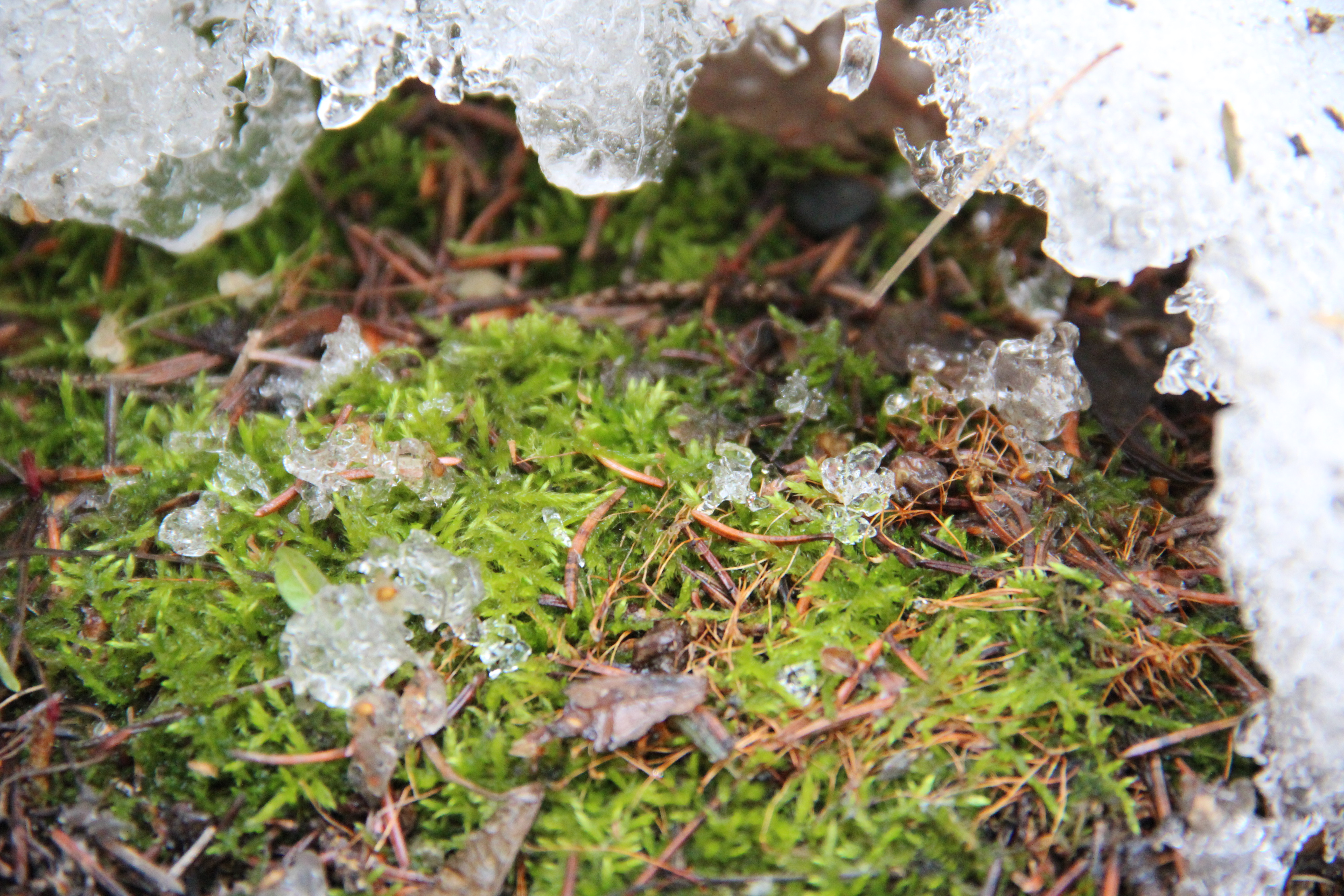 Early last week, I searched the few exposed patches of dirt for signs of bulbs pushing through the soil. No sign of bulbs in the north-facing garden, yet. Instead, I found the first bright green of the season: An oasis of moss tucked beneath a little cavern of melting snow under our spruce tree. Threaded with tiny seeds and spruce needles, the moss was the golden green of spring and droplets of melting snow refreshed it. Lovely, restful green; a beautiful, hopeful color after months of black and white.