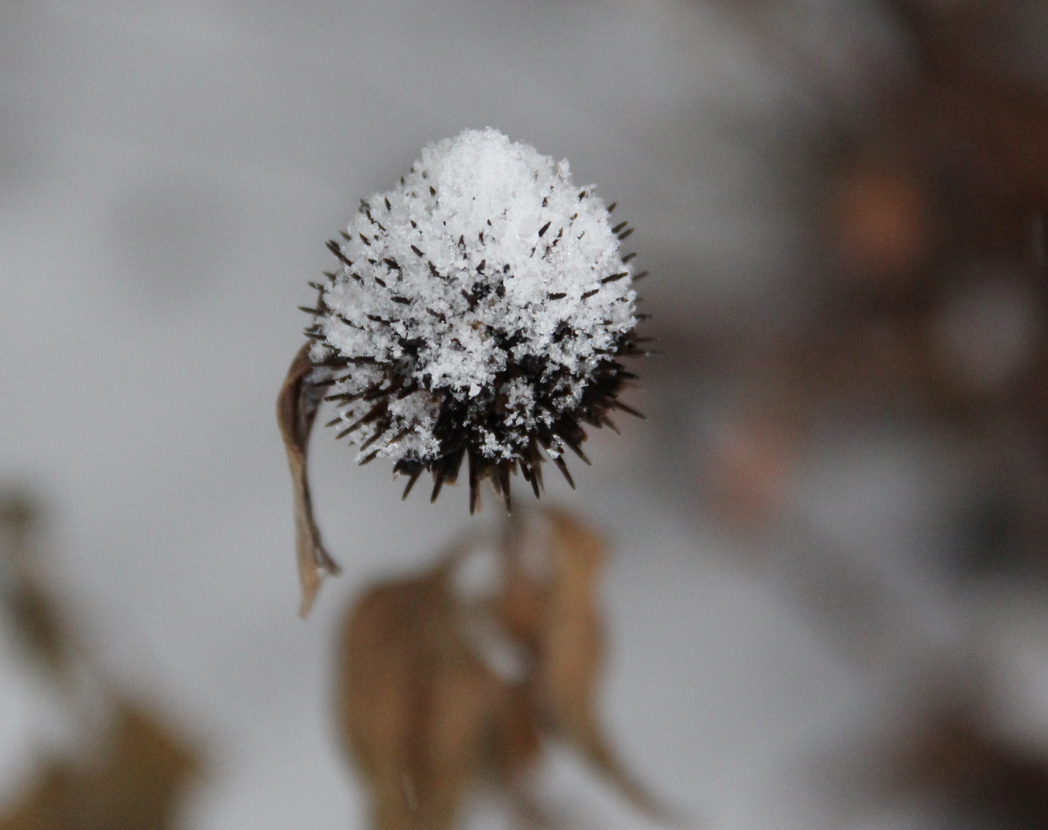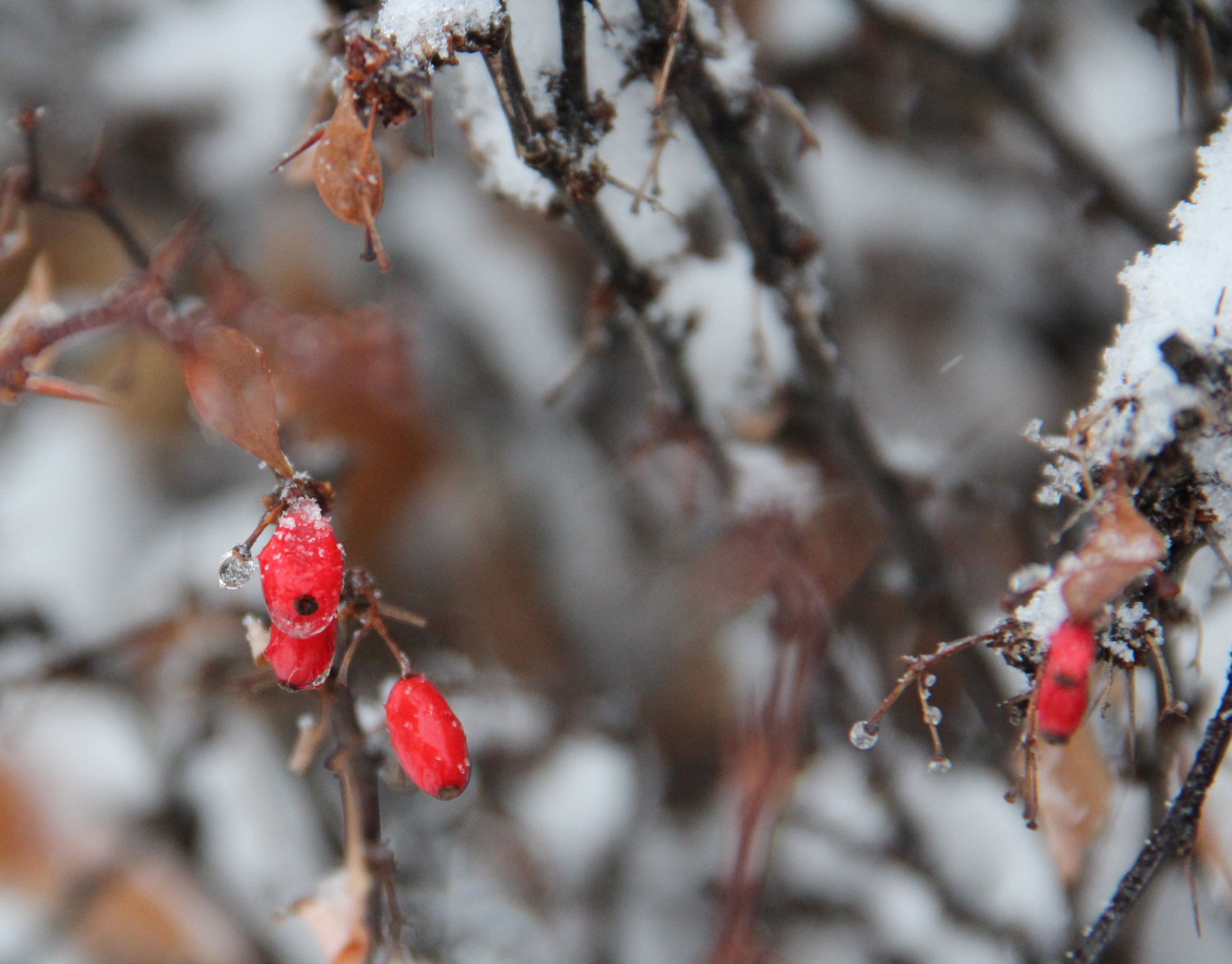 Crabapple trees, especially those with long-lasting fruit, add warm crimson to the stark black and white landscape. Their small shapes and curving branches remind me of bonsai trees. By late spring, most of the plump fruit will be consumed by cedar waxwings and robins.